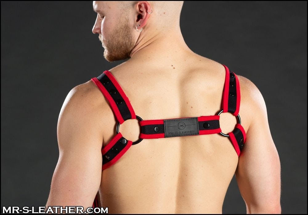 Mr. S Leather neoprene harness. Can be worn with a jockstrap from the CARBON BLACK collection featuring D-rings on the waistband. Super lightweight, you’ll love wearing it during a long night of dancing or fucking.